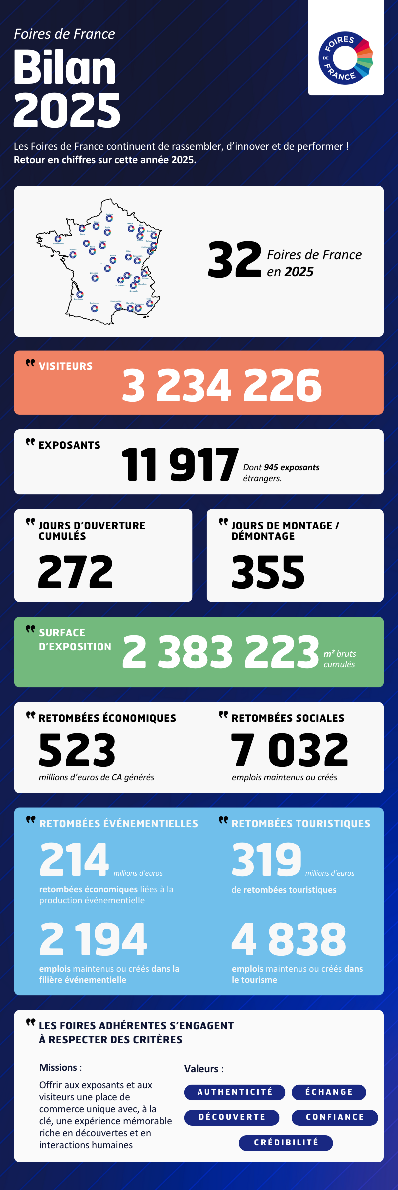 PANORAMA CHIFFRÉ "FOIRES DE FRANCE" 18 foires se sont mobilisées pour aboutir à la création du 2ème panorama Foires de France. La 3ème édition de cet outil sera publiée en juillet 2020 afin d’évaluer et valoriser les retombées et impacts socio-économiques, territoriaux et environnementaux 2019 des Foires-exposition. En savoir plus